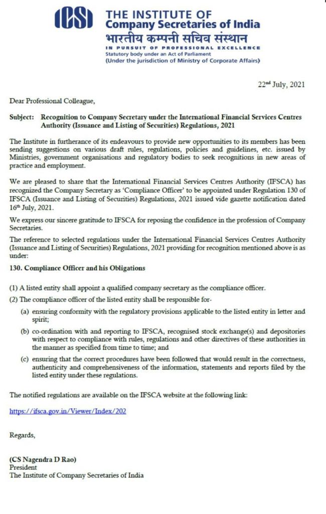 International Financial Services Centres Authority (IFSCA) has recognized the Company Secretary as ‘Compliance Officer’ to be appointed under Regulation 130 of IFSCA (Issuance and Listing of Securities) Regulations, 2021 issued vide gazette notification dated 16th July, 2021.
